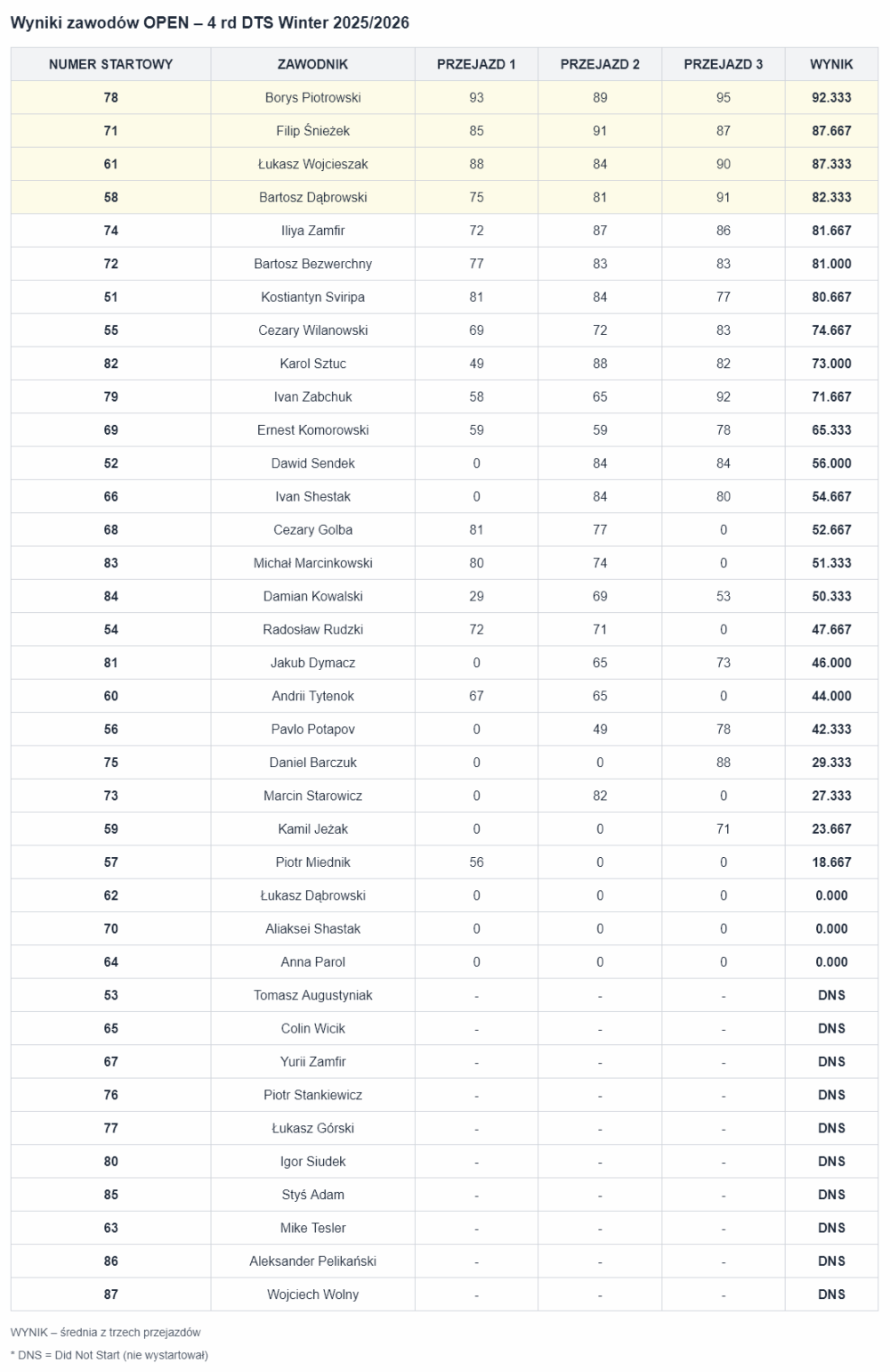 Wyniki zawodów 4 rundy – OPEN 2025/2026